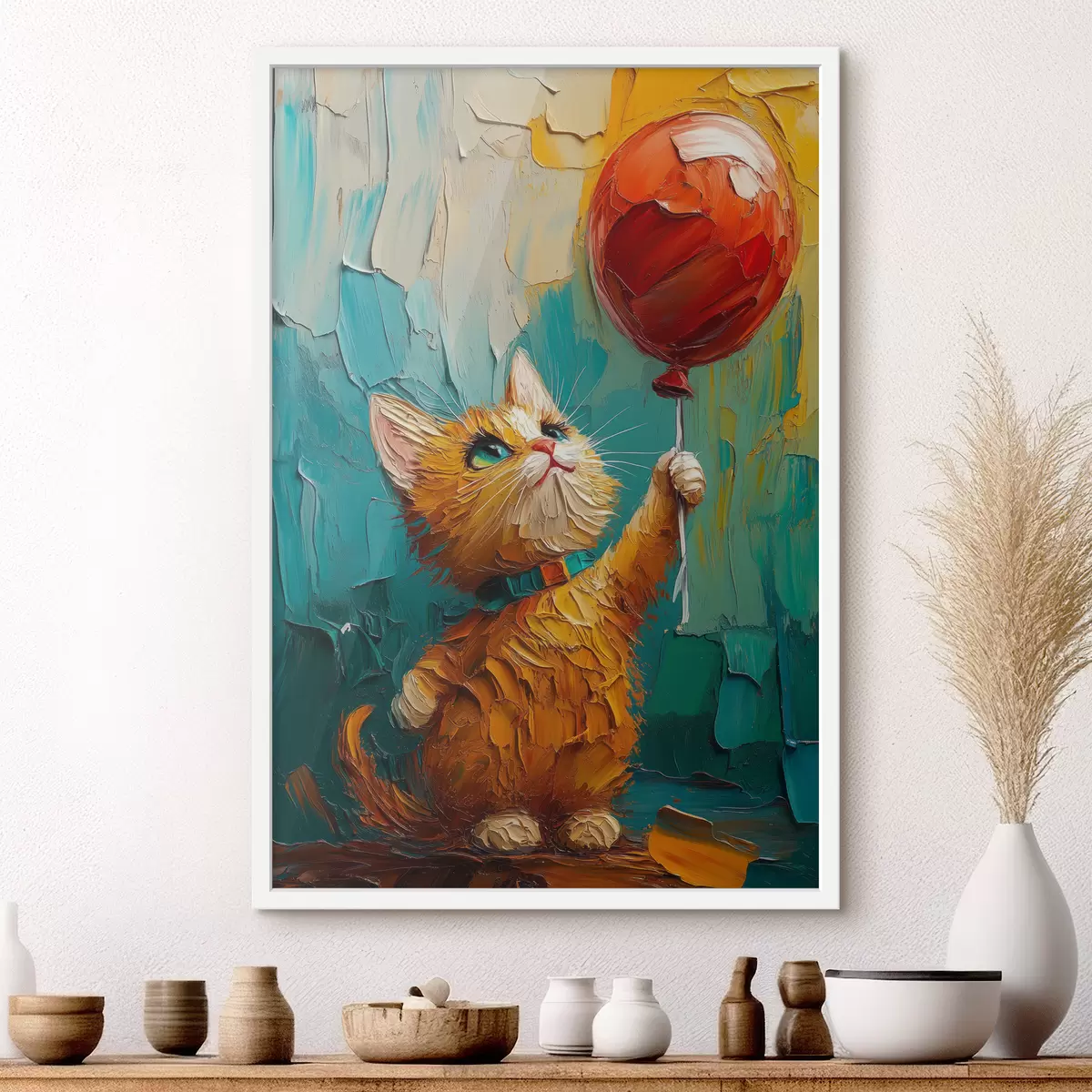 Poster Gatto rosso tiene in mano un palloncino, imitazione di un dipinto a olio Nr f40649