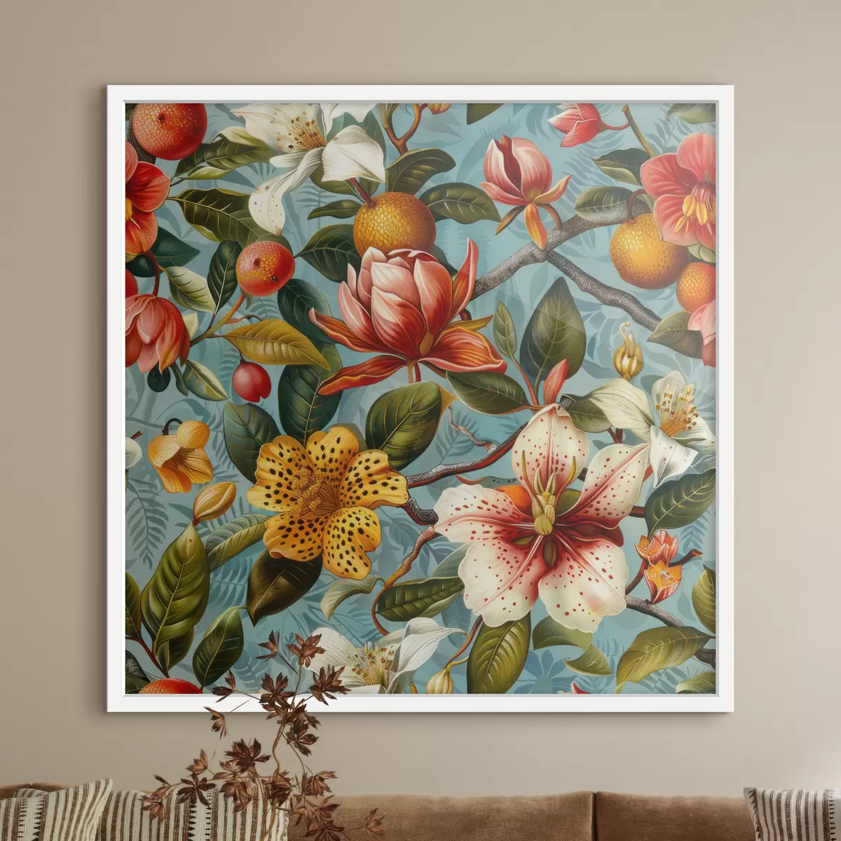 Poster Composizione tropicale con vari fiori verdi e tropicali su sfondo blu Nr f40665