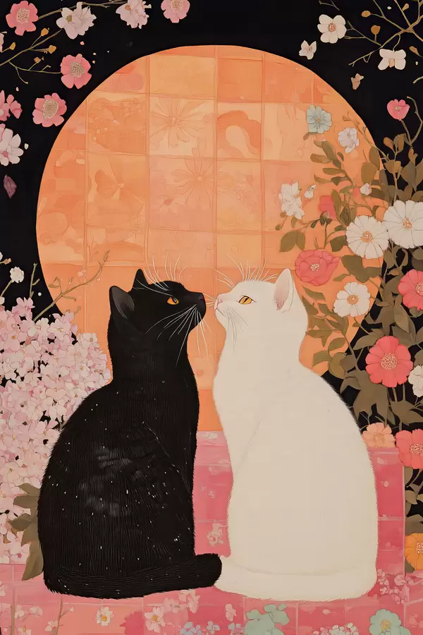 Poster Gatto nero e gatto bianco che si guardano con simpatia al tramonto Nr f40669