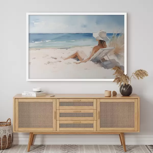 Poster Ragazza che si rilassa sulla spiaggia in riva al mare acquerello Nr f40679
