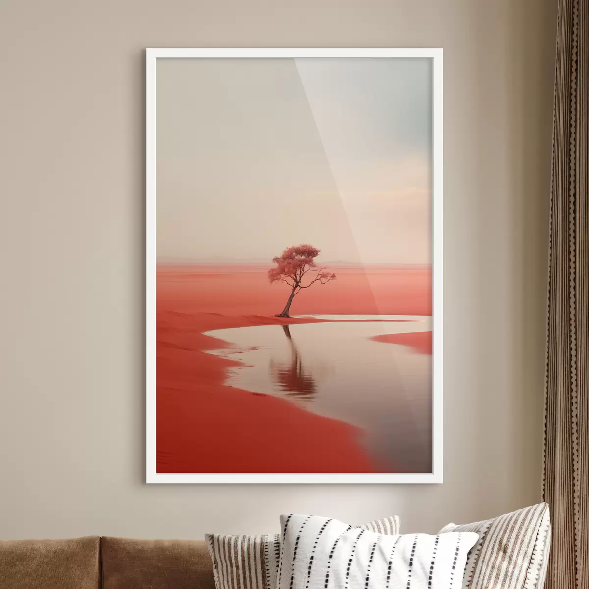 Poster Paesaggio minimalista albero vicino al fiume, rosso, grigio colore Nr f40722