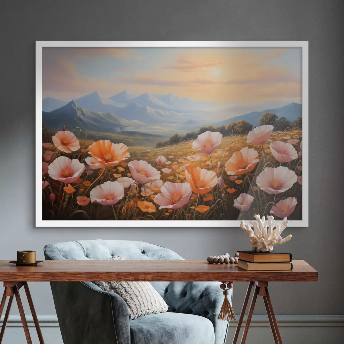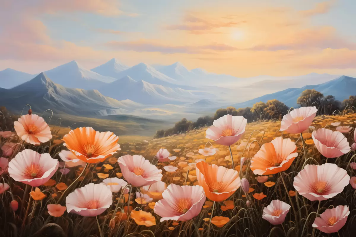 Poster Campo di papaveri all'alba con le montagne sullo sfondo f40730