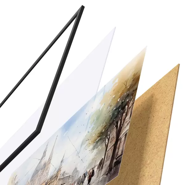 Il poster è composto da cornice, plexiglass, immagine stampata e supporto in truciolato. Il poster può essere immediatamente appeso alla parete grazie ai supporti sul retro.