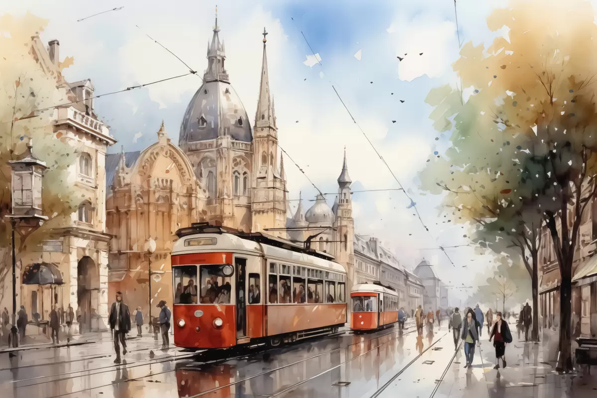 Poster Tram rosso sulla strada di Vienna acquerello f40732