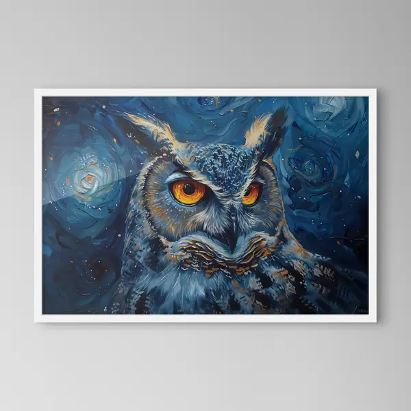 Poster Lo sguardo di un gufo di notte con un cielo in stile Van Gogh f40982