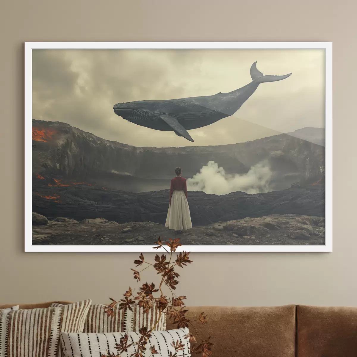Poster Ragazza sulla lava con una grande balena volante nel cielo Nr f40986