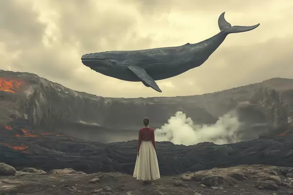 Poster Ragazza sulla lava con una grande balena volante nel cielo f40986