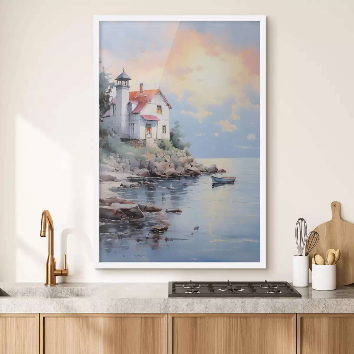 Poster Casa sulla spiaggia in riva al mare al tramonto Nr f41010