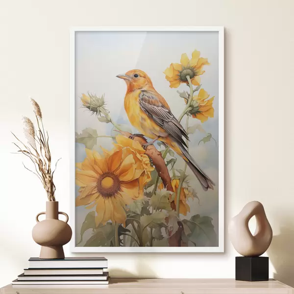 Poster Uccello giallo seduto su girasole acquerello Nr f41015