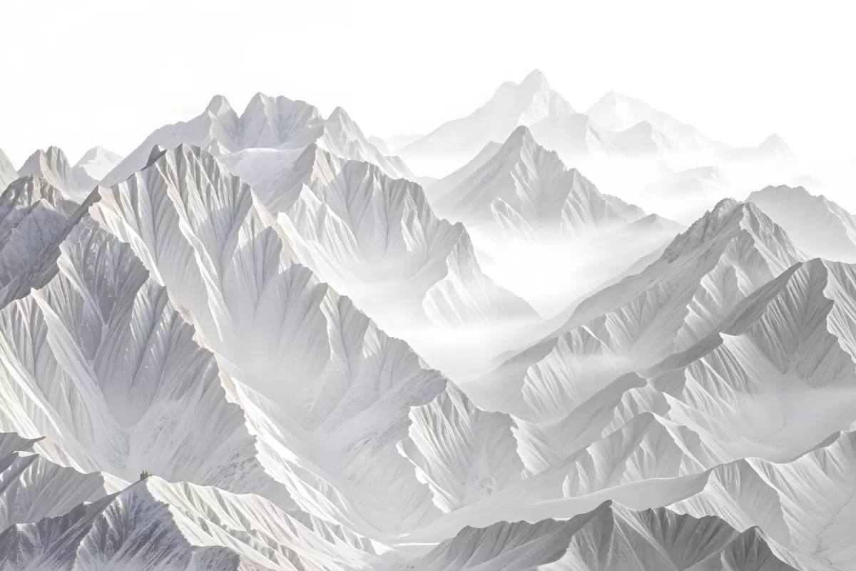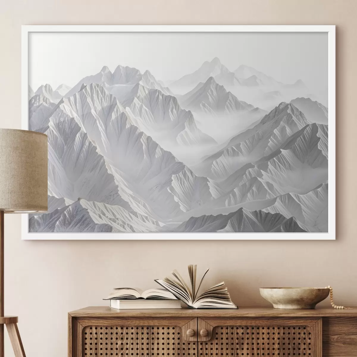 Poster Cime di montagna minimaliste innevate in un paesaggio nebbioso e brumoso Nr f41083