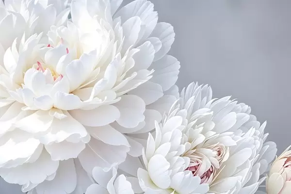 Poster Fiori di peonia bianchi con petali morbidi e delicati su uno sfondo grigio chiaro Nr f41085