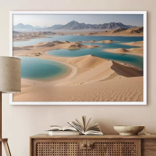 Poster Un vasto paesaggio desertico con dune di sabbia e laghi turchesi, circondato da aspre montagne Nr f41087