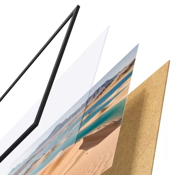 Il poster è composto da cornice, plexiglass, immagine stampata e supporto in truciolato. Il poster può essere immediatamente appeso alla parete grazie ai supporti sul retro.