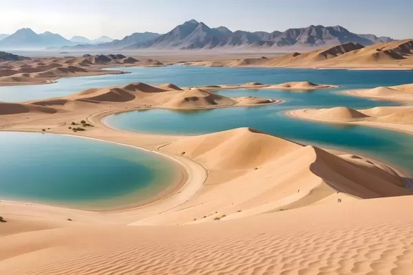 Poster Un vasto paesaggio desertico con dune di sabbia e laghi turchesi, circondato da aspre montagne Nr f41087