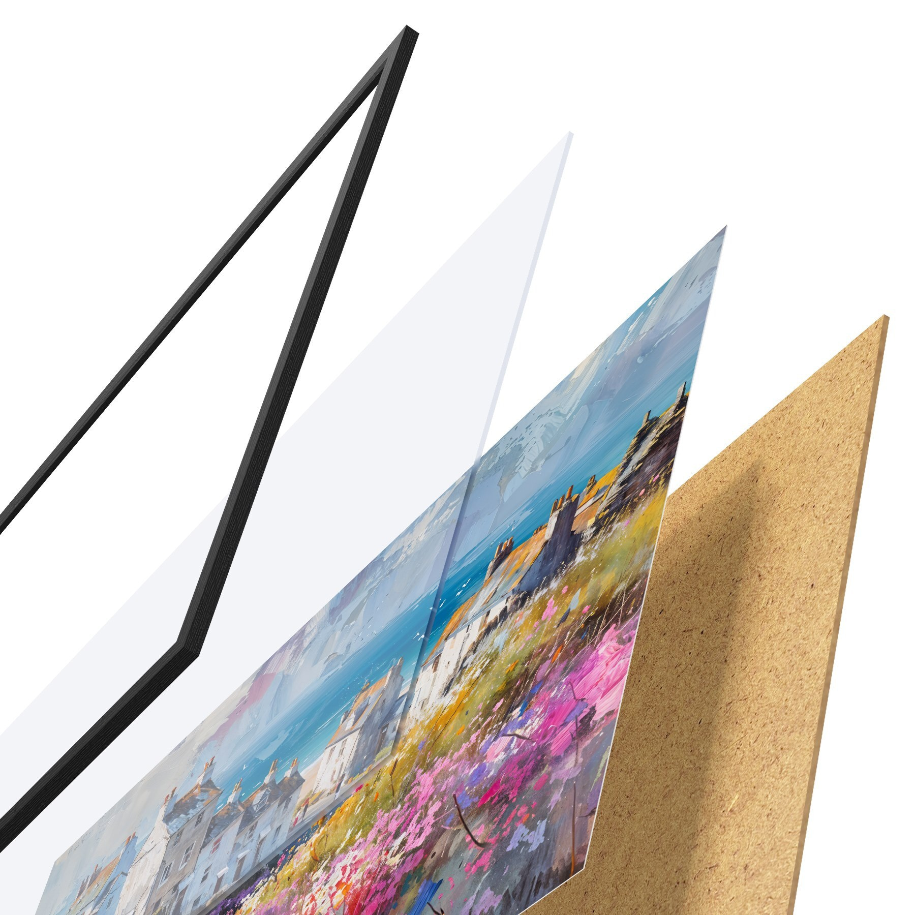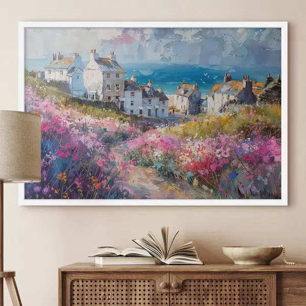Poster Una colorata città costiera dipinta a olio con case bianche e un vivace giardino fiorito in primo piano Nr f41090
