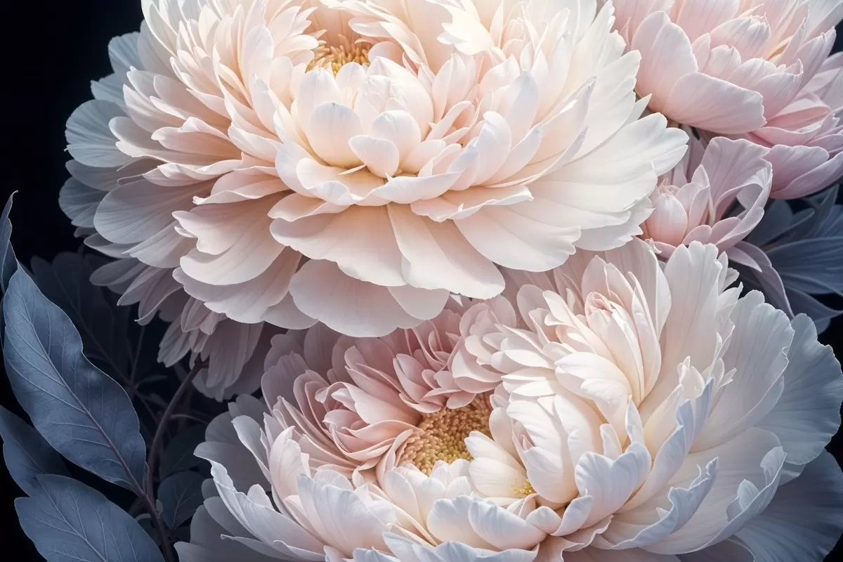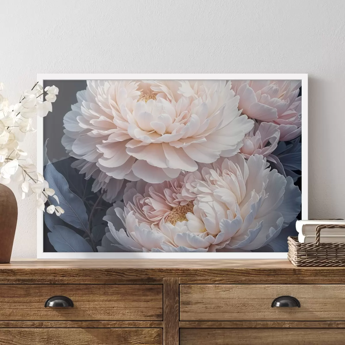 Poster Delicate peonie rosa pastello con petali morbidi e soffici e foglie blu su uno sfondo scuro Nr f41092