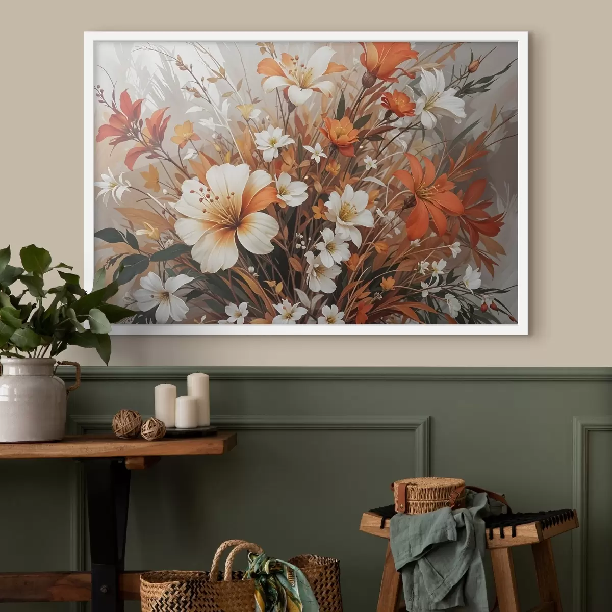 Poster Un vivace bouquet di fiori bianchi e arancioni, tra cui gigli e altre delicate fioriture Nr f41099