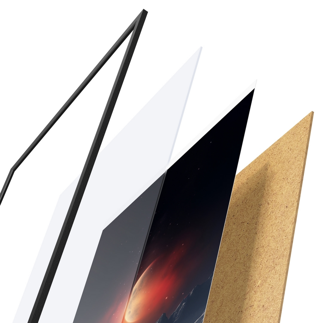 Il poster è composto da cornice, plexiglass, immagine stampata e supporto in truciolato. Il poster può essere immediatamente appeso alla parete grazie ai supporti sul retro.