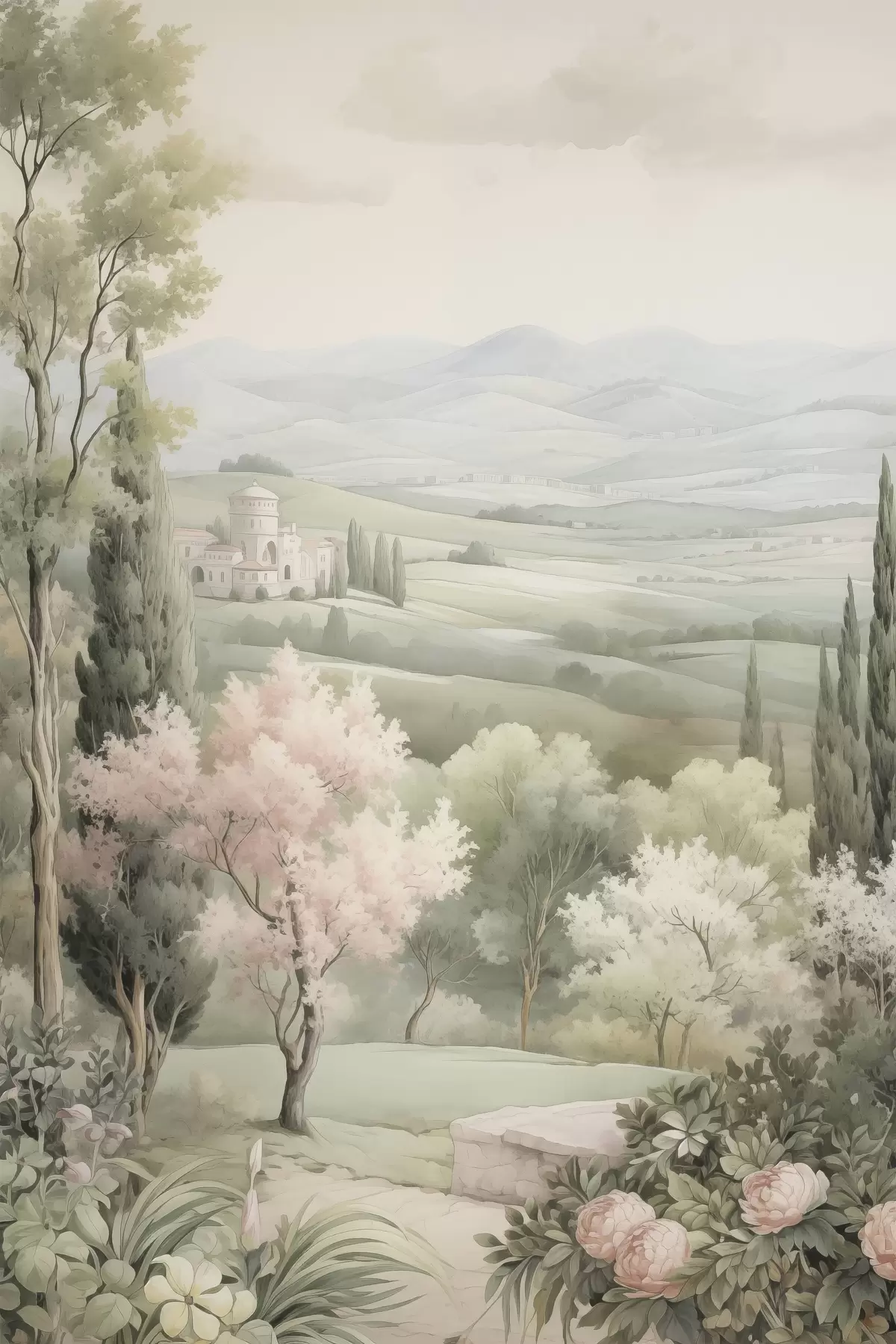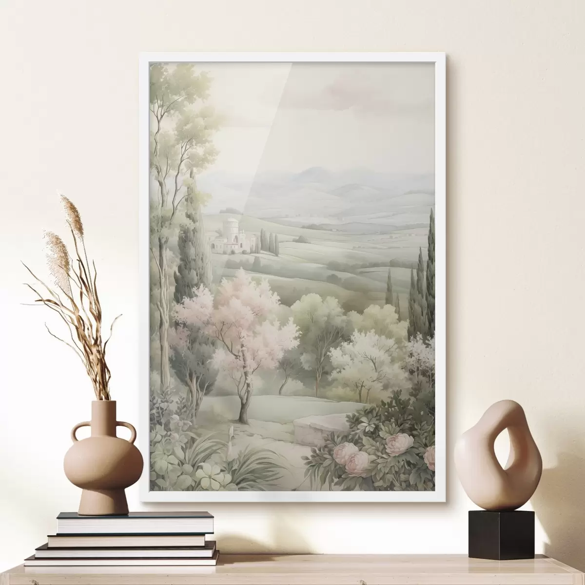 Poster Natura acquerellata, colori tenui, rose, alberi, colline verdi Nr f41223