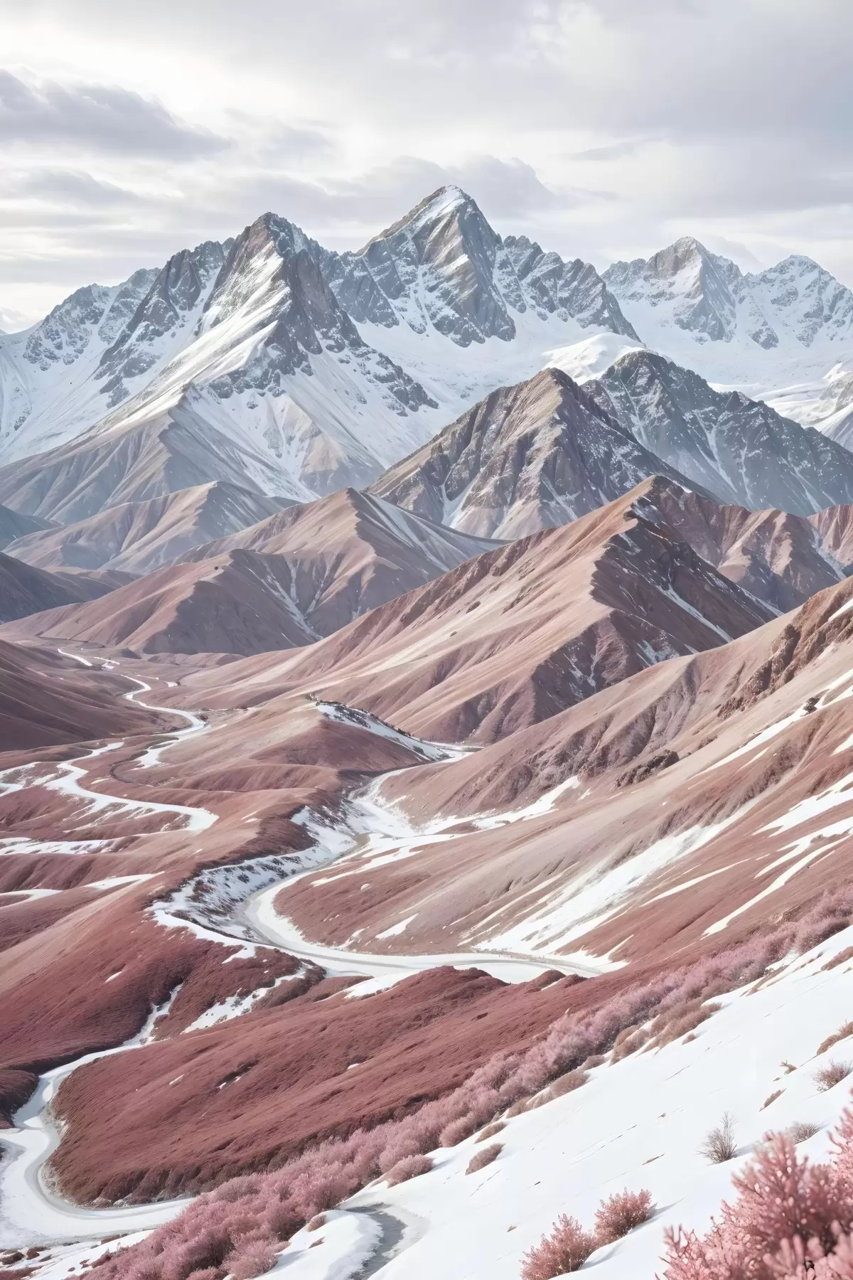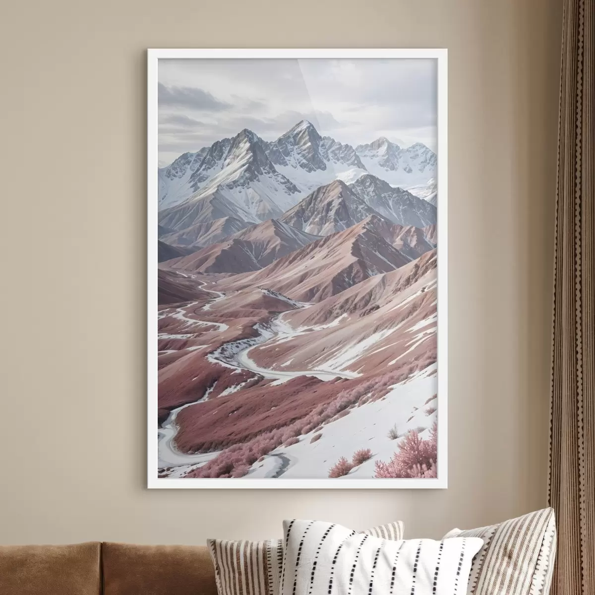 Poster Montagne aspre e innevate con un fiume tortuoso che scorre in un paesaggio vasto e colorato Nr f41262