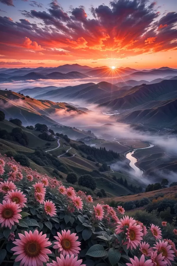 Poster Un paesaggio mozzafiato con un tramonto vibrante su una regione montuosa con grappoli di fiori rosa f41263