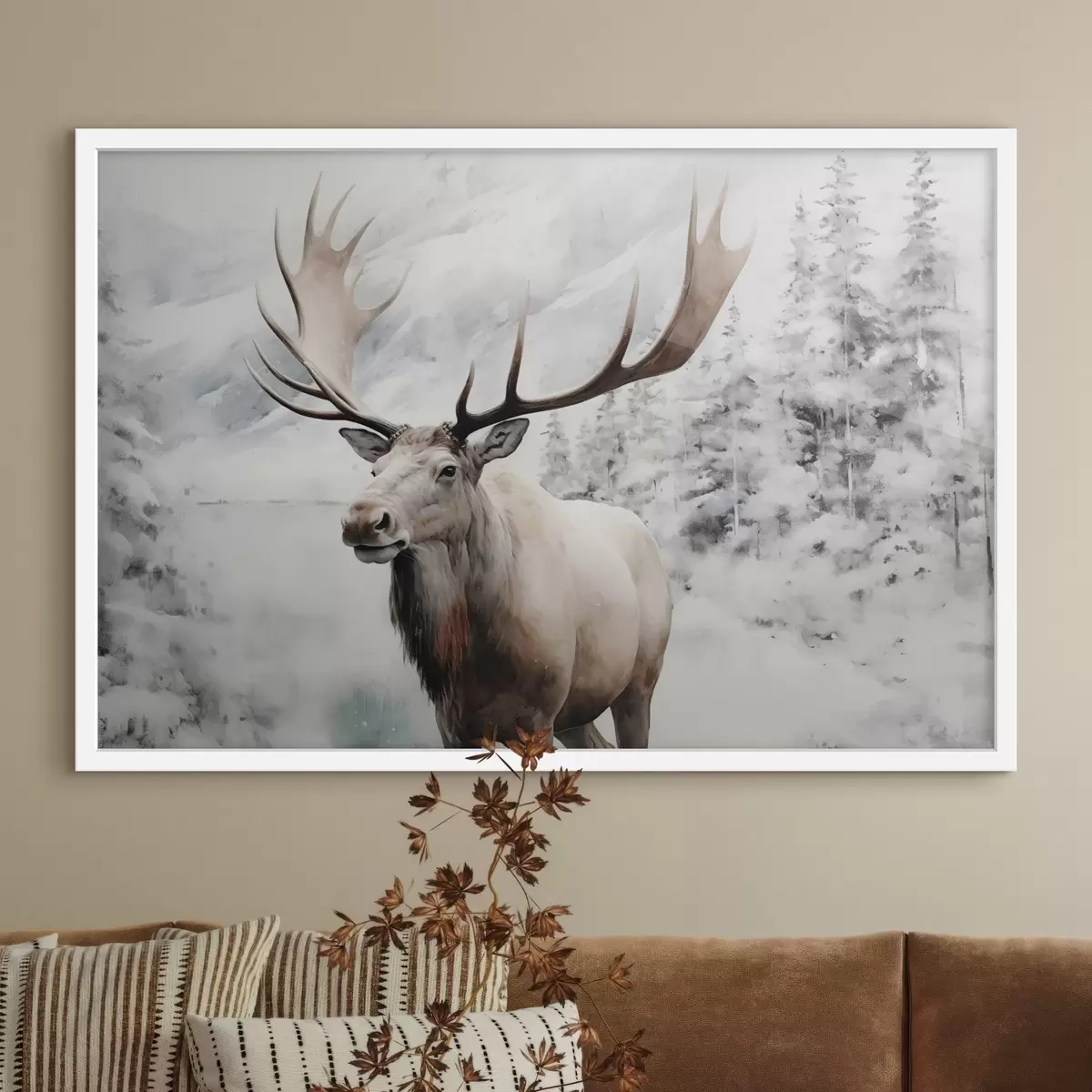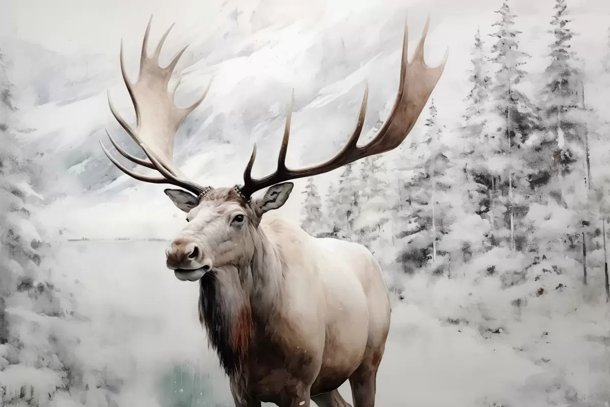 Poster Alce sullo sfondo di una foresta invernale nella neve acquerello Nr f41284