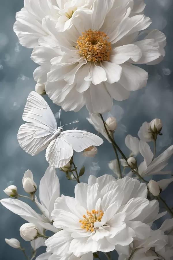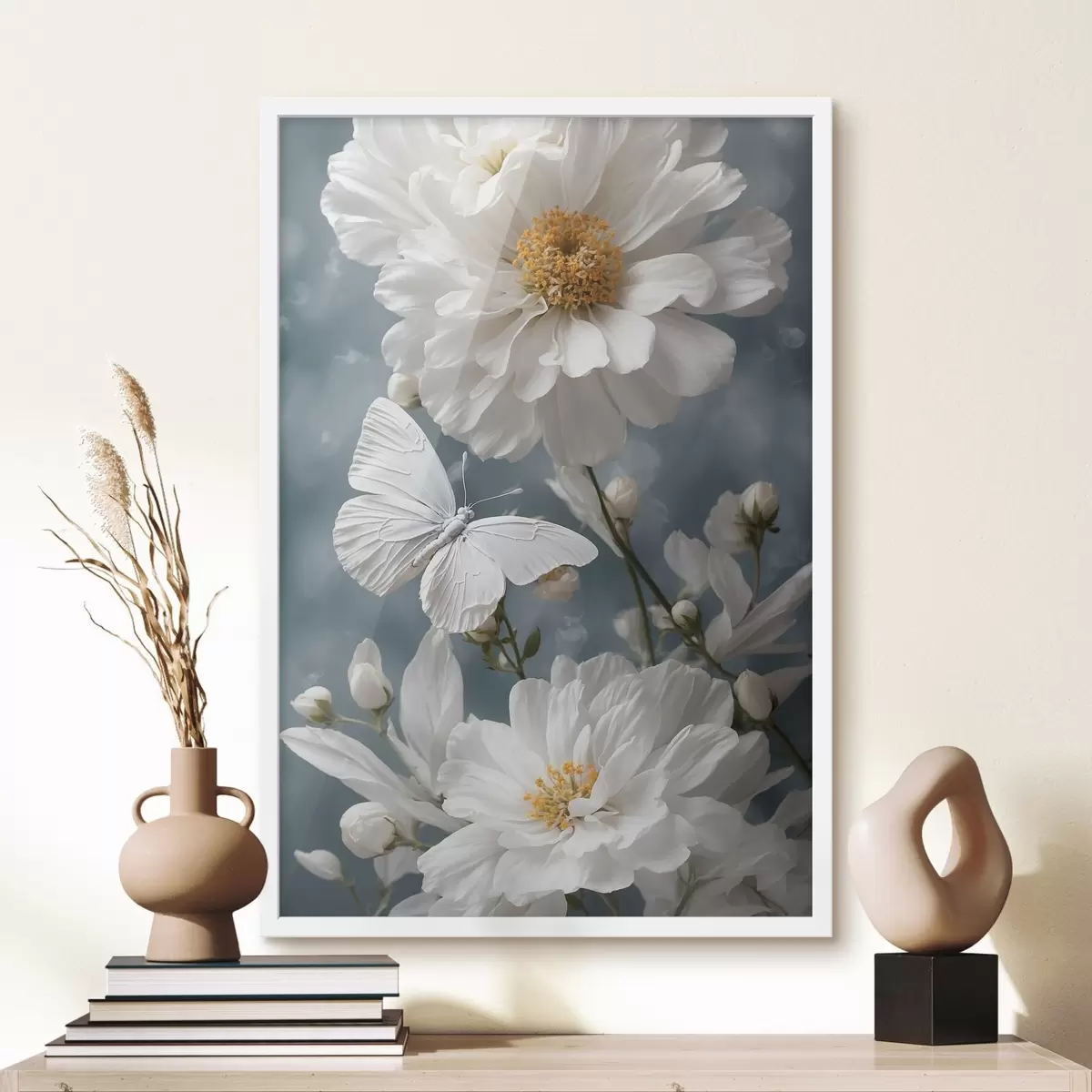 Poster Fiori bianchi e farfalla su sfondo sfocato f41312