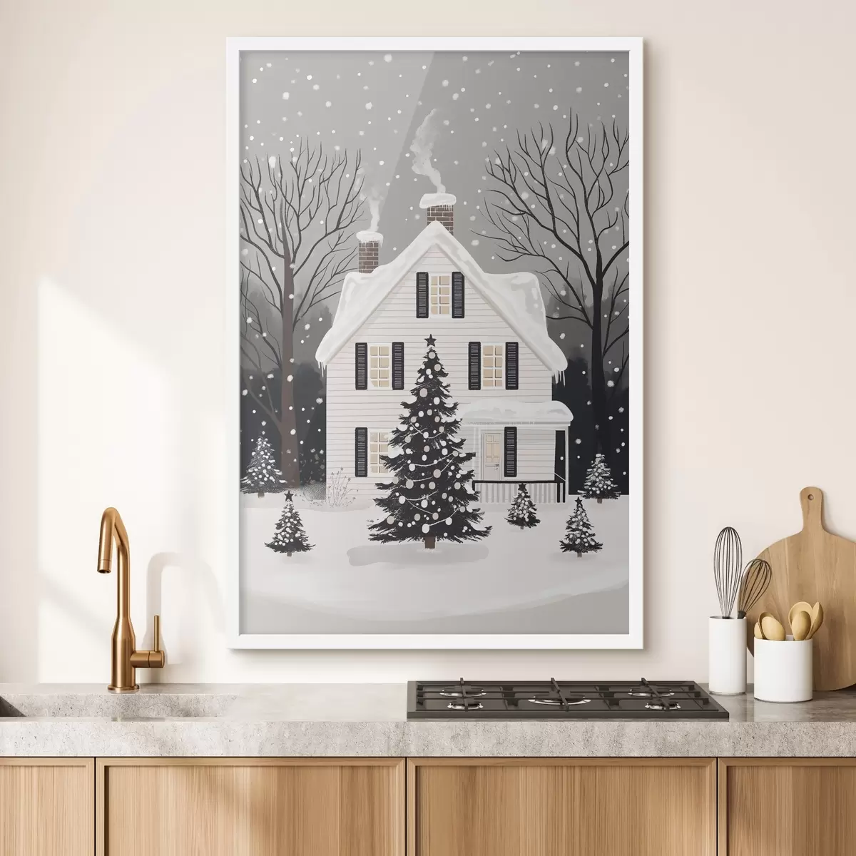 Poster Città invernale, pino decorato, Natale, foresta, bella casa Nr f41371