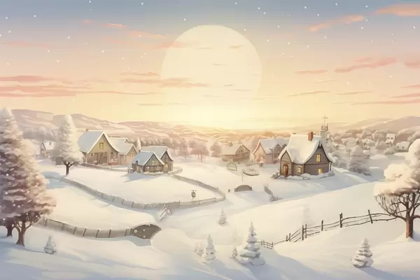 Poster Villaggio invernale al tramonto, case coperte di neve e pini Nr f41380