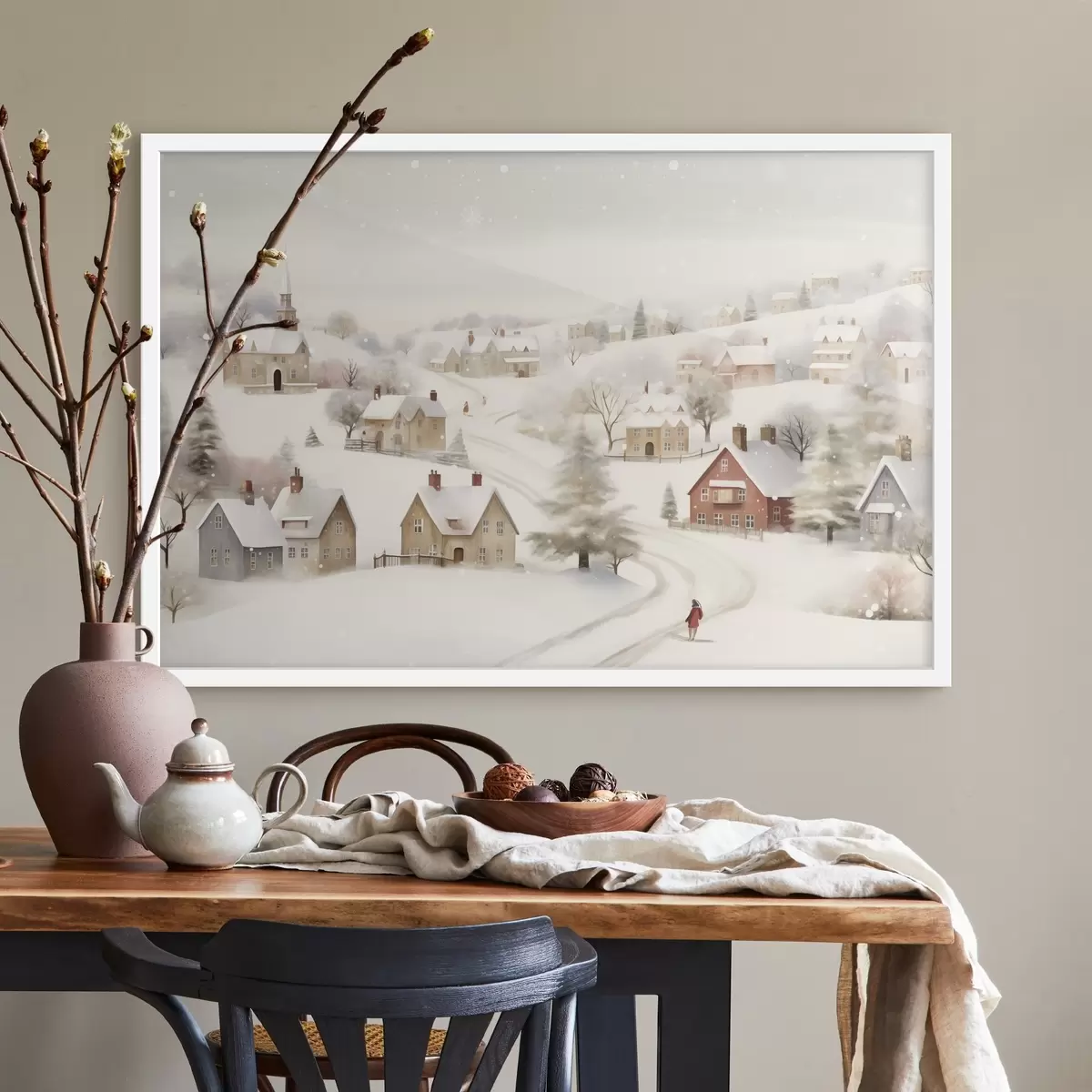 Poster Villaggio invernale, acquerello, fiocchi di neve, colori tenui, alberi, paesaggio f41381