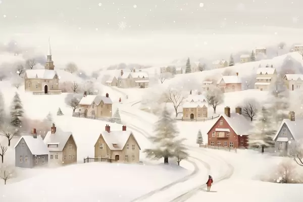 Poster Villaggio invernale, acquerello, fiocchi di neve, colori tenui, alberi, paesaggio f41381