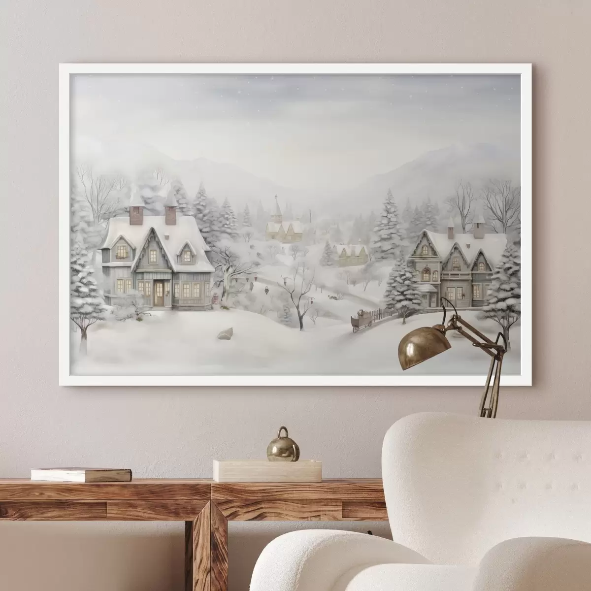 Poster Bellissimo paesaggio invernale con villaggio, pini, case e montagne f41384