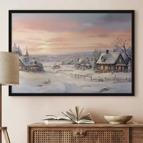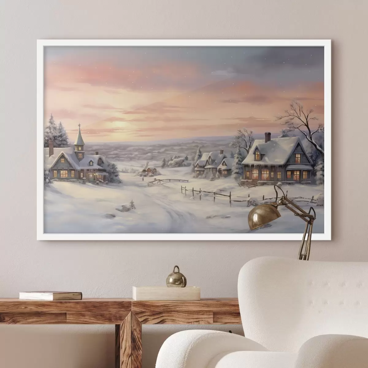 Poster Tramonto nel villaggio invernale, rustico, acquerello, fiocchi di neve f41386