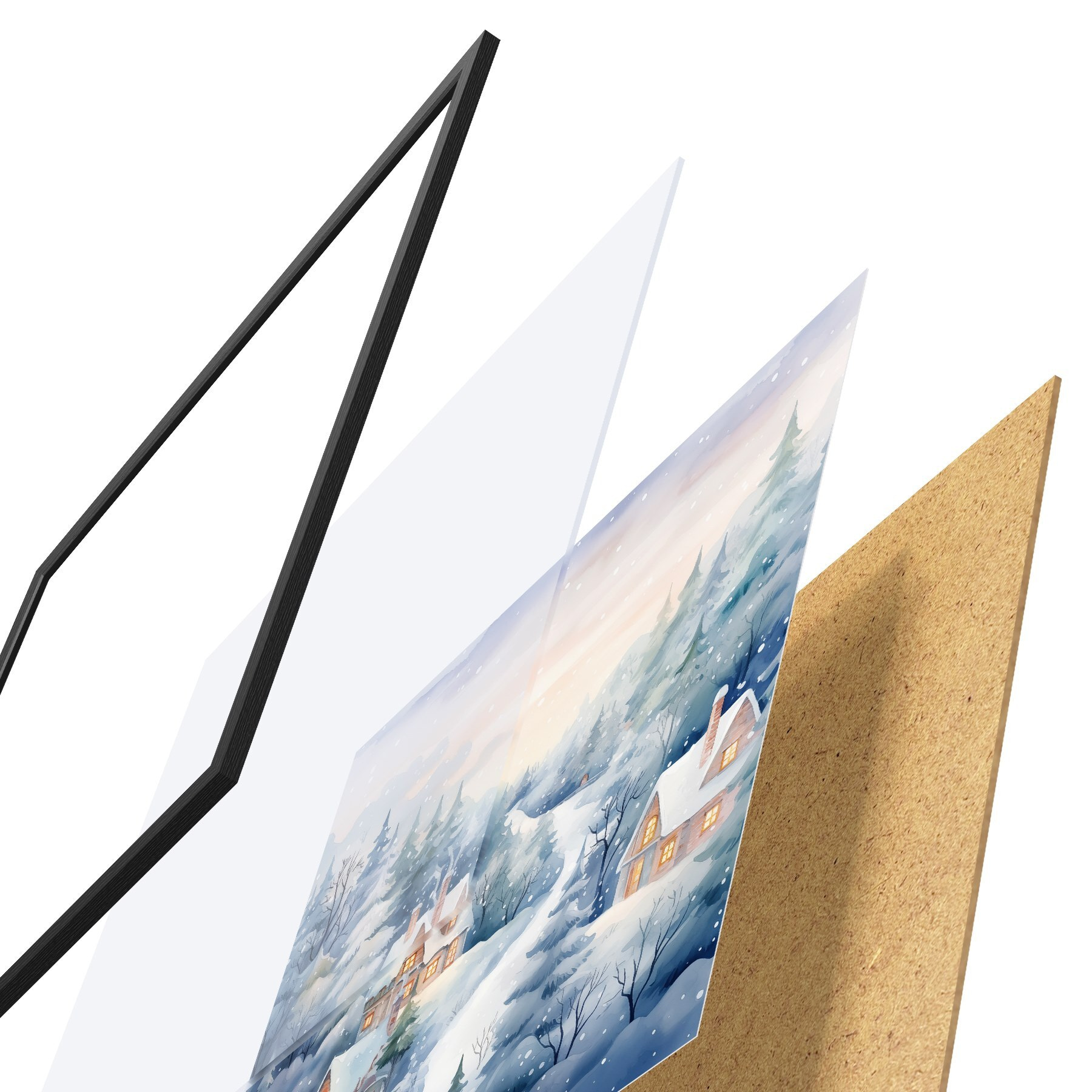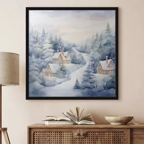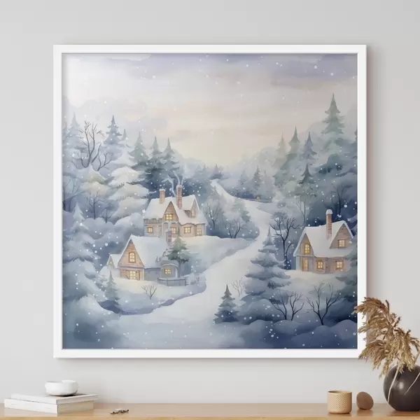 Poster Paesaggio invernale acquerellato, pineta, case Nr f41387