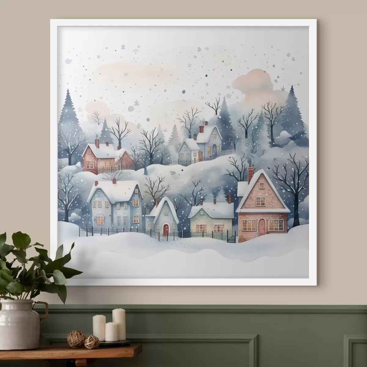 Poster Paesaggio invernale acquerellato con case e pineta Nr f41389