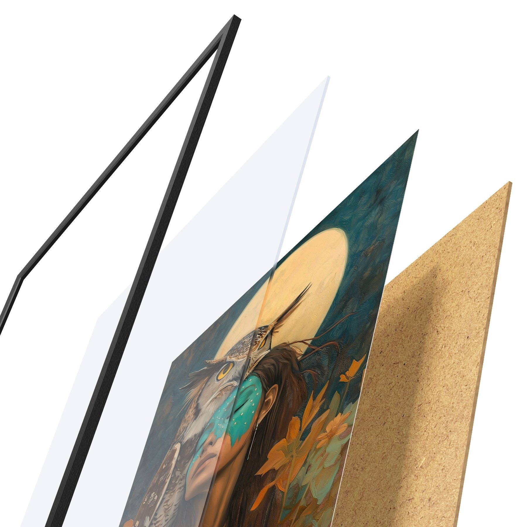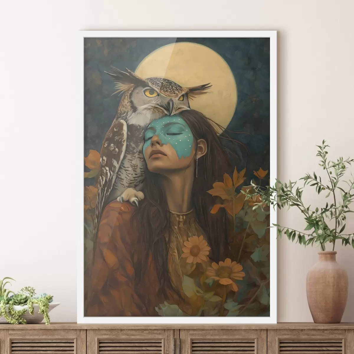 Poster Donna con gufo, stile tribale, luna piena, fiori Nr f41444