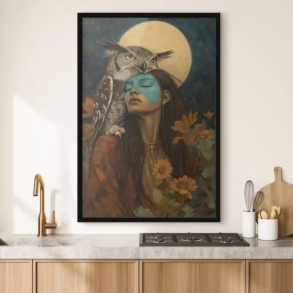 Poster Donna con gufo, stile tribale, luna piena, fiori f41444