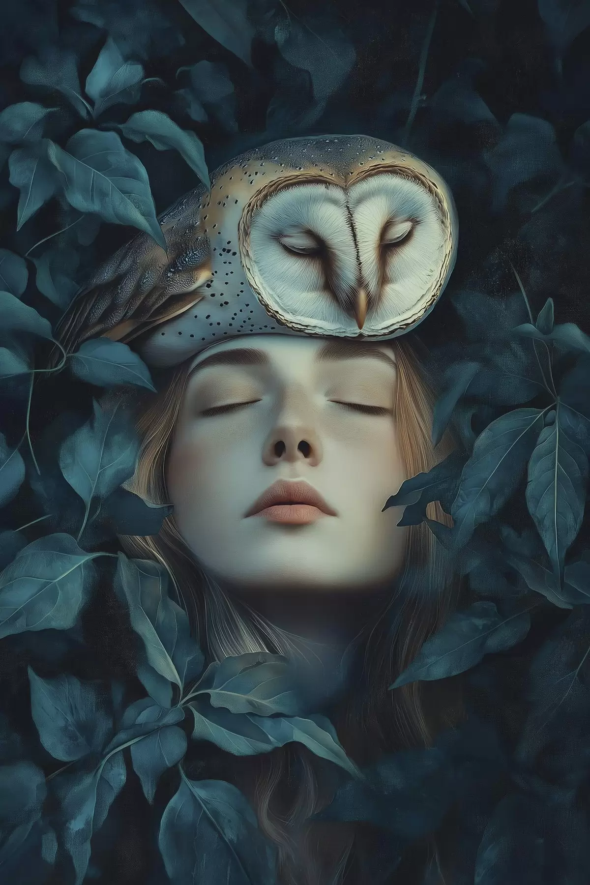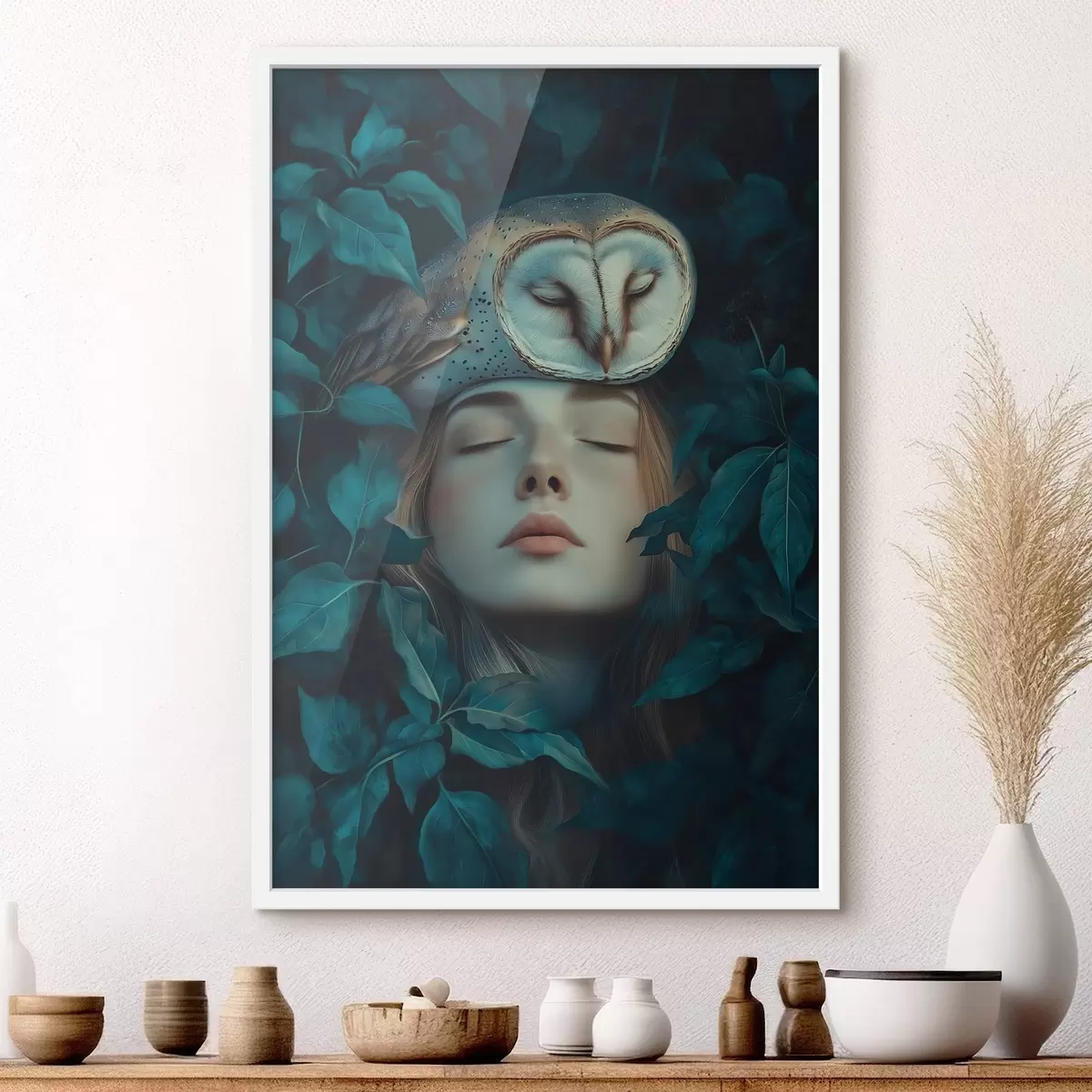 Poster Donna con gufo tra le foglie verdi, pace, natura Nr f41445