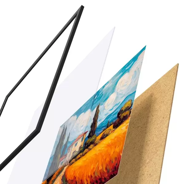 Il poster è composto da cornice, plexiglass, immagine stampata e supporto in truciolato. Il poster può essere immediatamente appeso alla parete grazie ai supporti sul retro.