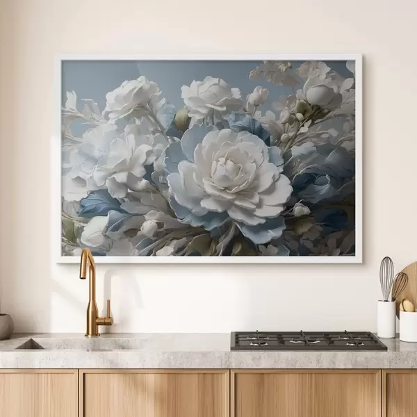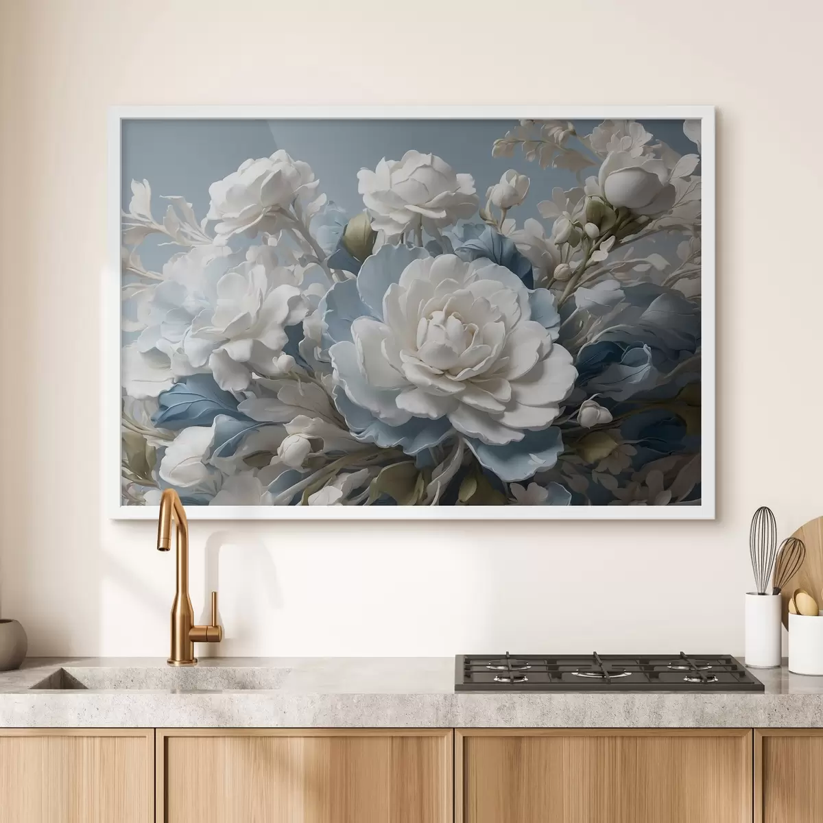 Poster Fiori e foglie bianche su sfondo blu Nr f41527