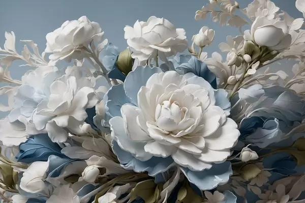 Poster Fiori e foglie bianche su sfondo blu Nr f41527