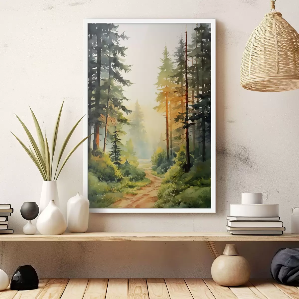 Poster Bellissima foresta acquerellata con pini e luce delicata del sole Nr f41637