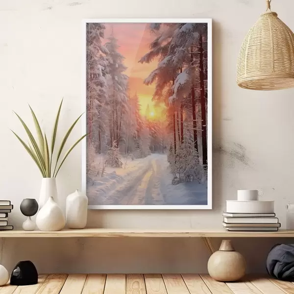 Poster Un sentiero nella foresta invernale, neve, pini, colori del tramonto Nr f41639