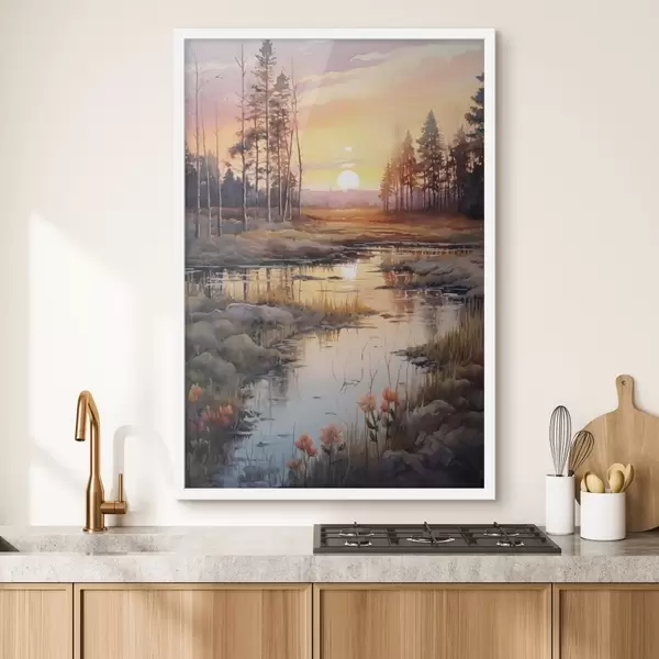 Poster Bellissimo fiume nella foresta autunnale, acquerello, prato, cielo al tramonto Nr f41643