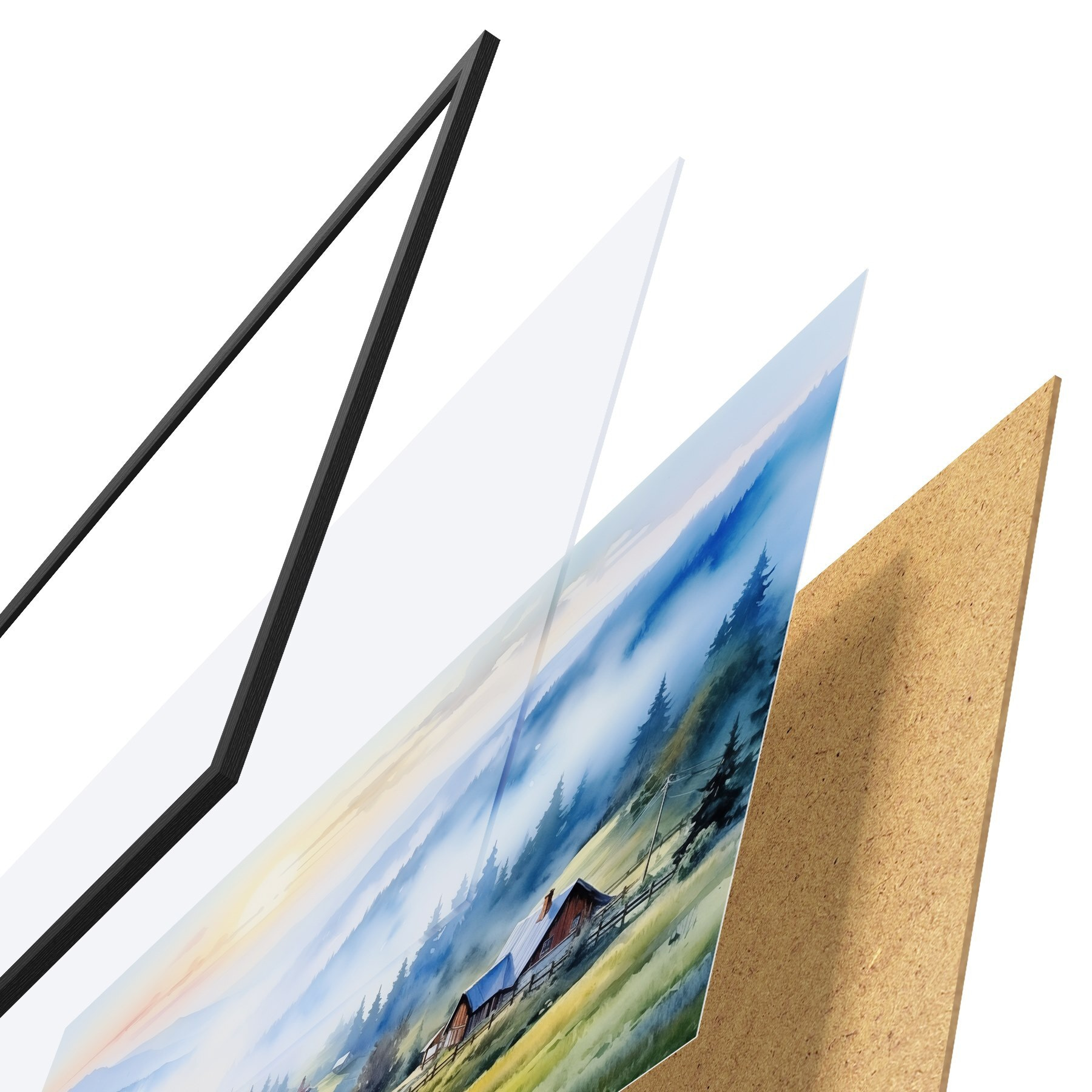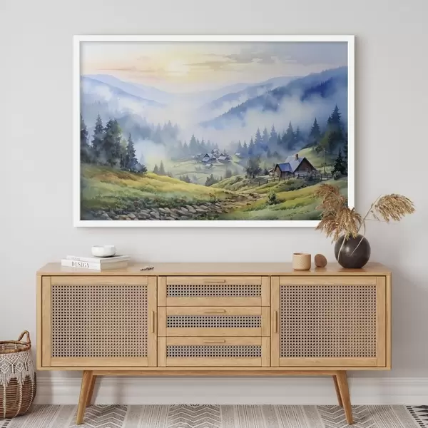 Poster Villaggio dei Carpazi tra le montagne nebbiose, foresta, acquerello Nr f41648