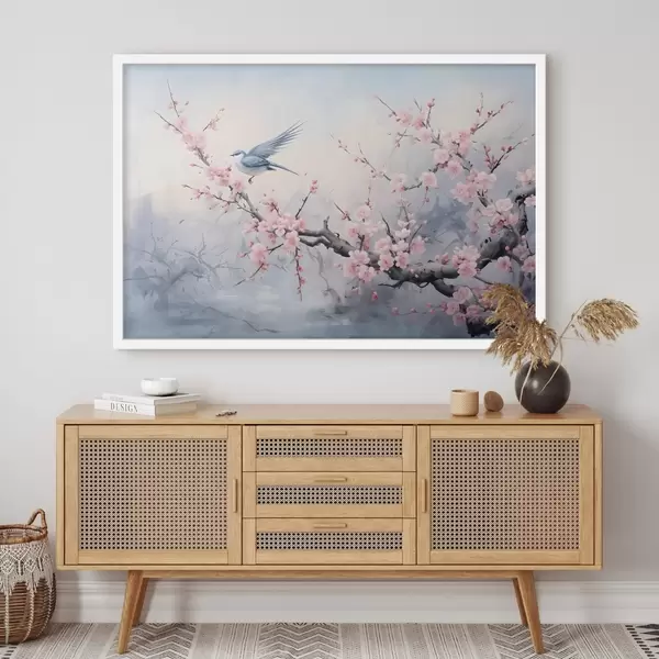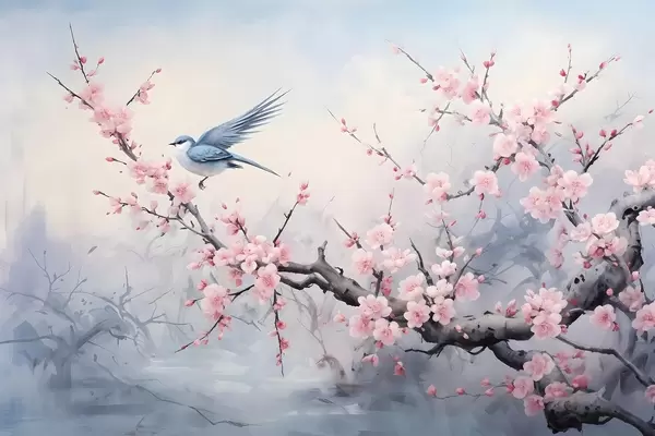 Poster Uccello blu che vola tra i fiori di ciliegio rosa su uno sfondo nebbioso di primavera Nr f41712