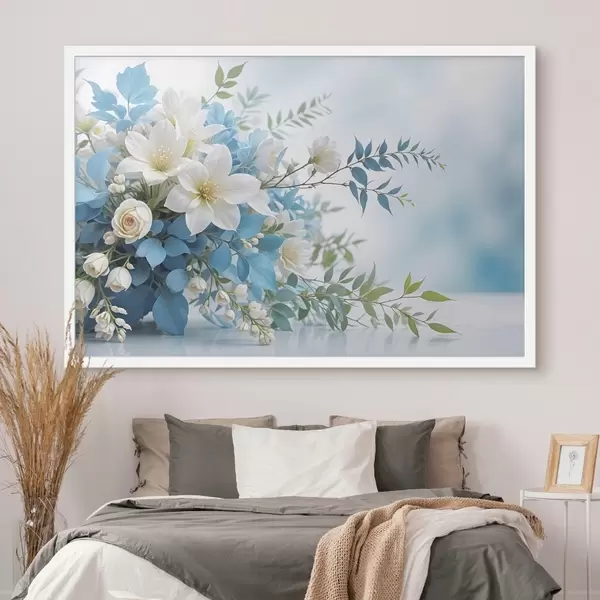 Poster Un bouquet di fiori bianchi e blu con foglie verdi su uno sfondo morbido e sfuocato f41715