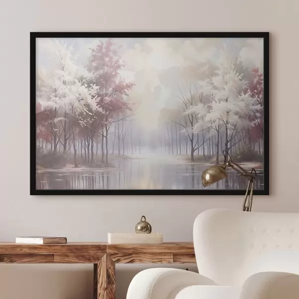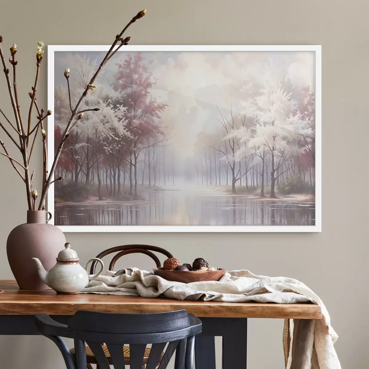 Poster Un paesaggio sereno con una foresta nebbiosa, alberi spogli e un lago calmo che riflette i toni tenui del rosa e del bianco Nr f41720