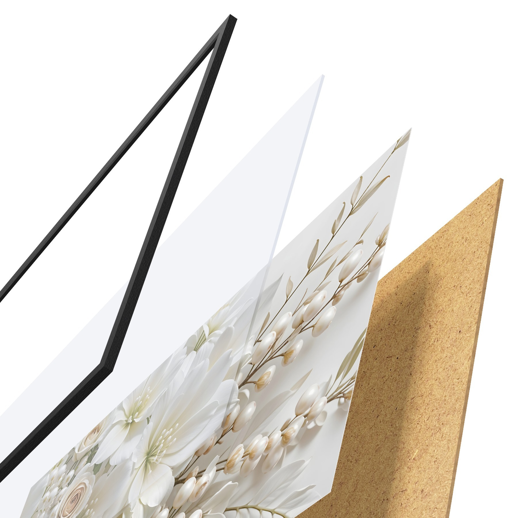 Poster Delicati fiori bianchi, tra cui gigli, rose e altri fiori con petali morbidi e vellutati f41722