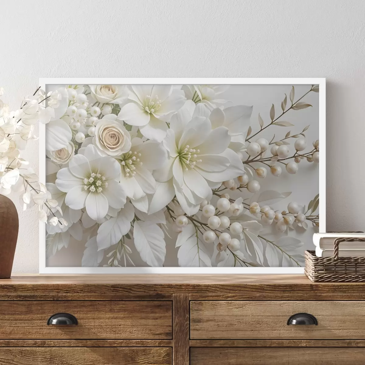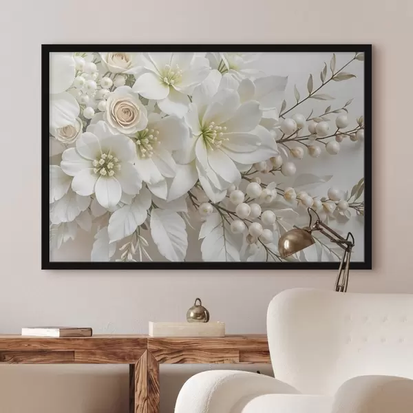 Poster Delicati fiori bianchi, tra cui gigli, rose e altri fiori con petali morbidi e vellutati Nr f41722